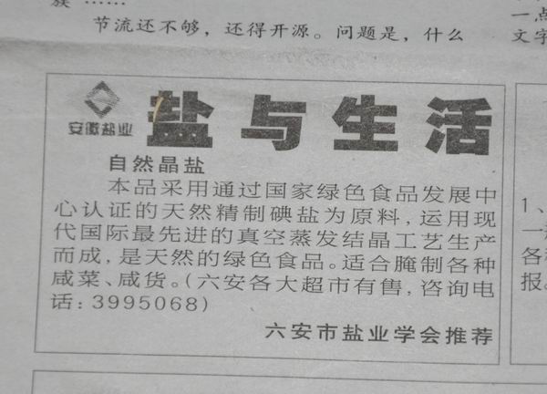 為了提高企業(yè)知名度,優(yōu)化鹽品銷售結構,滿足市民不同層次的鹽品消費需求和挖掘潛在需求,自今年“3.15消費者權益保護日”開始,六安市公司在當?shù)匕l(fā)行量最大的地方平面媒體《大別山晨刊》上,開設“鹽與生活”專欄。通過專欄形象設計,增強消費者的視覺感受,吸引讀者的眼球;通過刊載貼近百姓生活的可讀性內(nèi)容,拓展鹽品使用寬度。